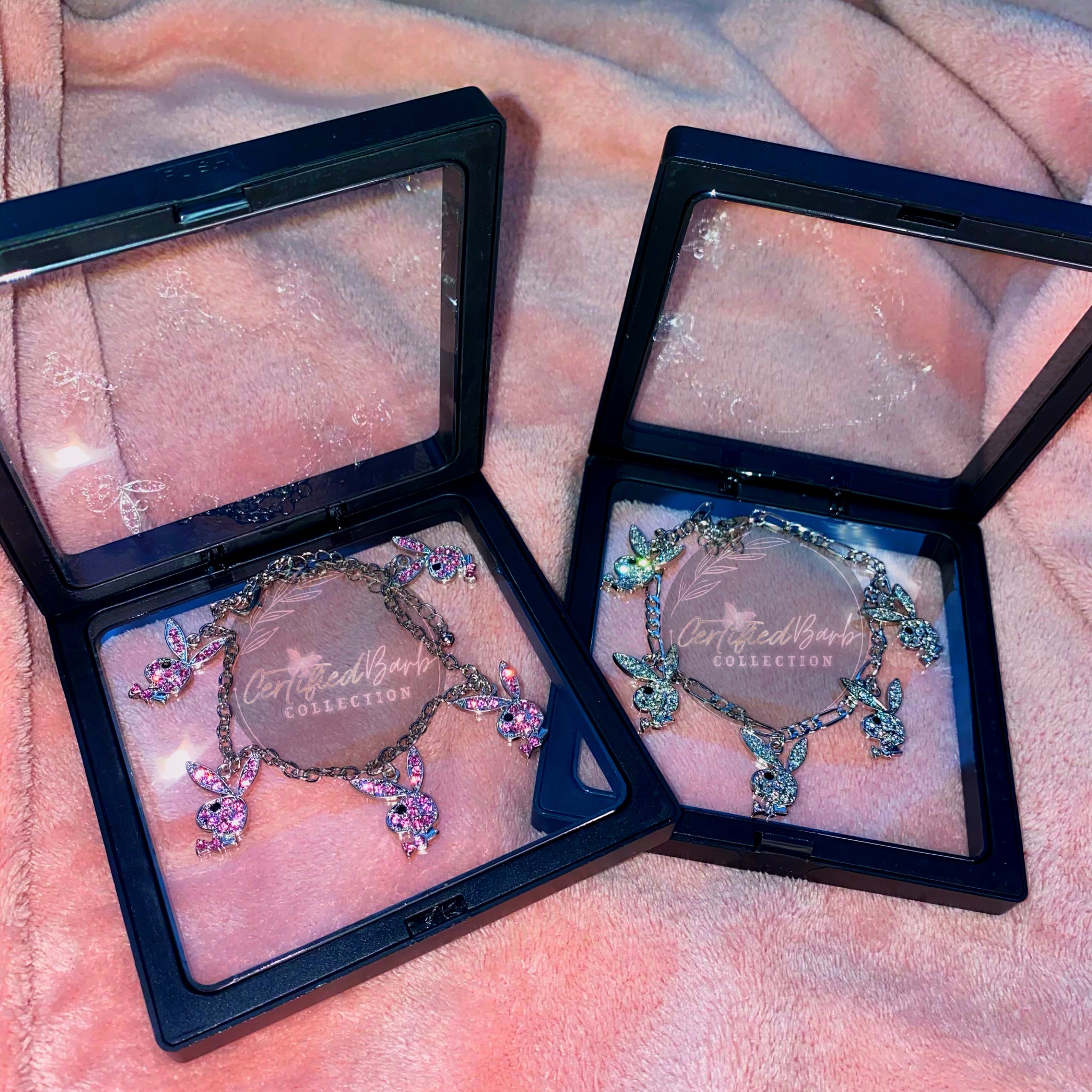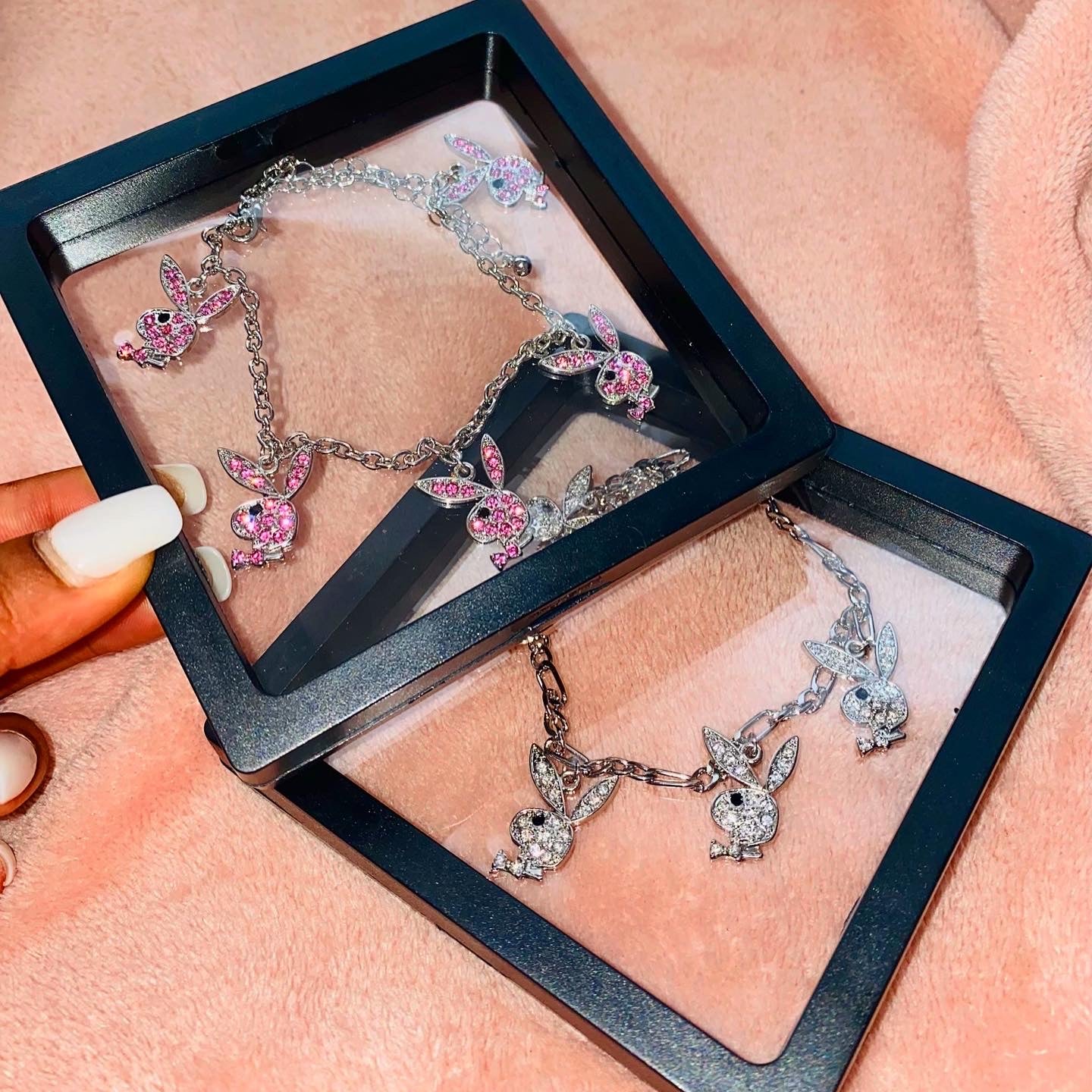 Pb inspired bunny anklet is sterling silver. Can be worn everyday. Anklets are adjustable to any ankle size. Comes in silver and comes pink.